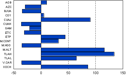| Tláhuac | 146,923 | 206,700 | 255,891 | 302,790 | 344,106 | 134.2 | |